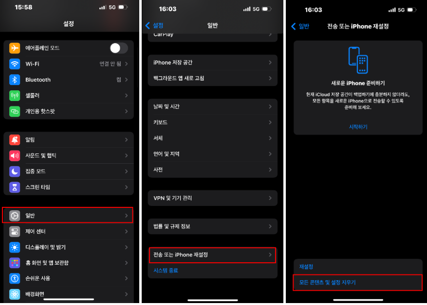 → 모든 콘텐츠 및 설정 지우기