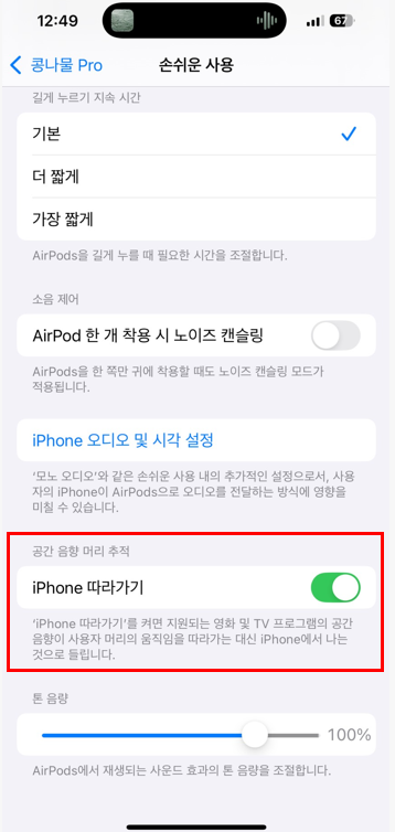설정 → 손쉬운 사용 → AirPods → iPhone 따라가기 켜기