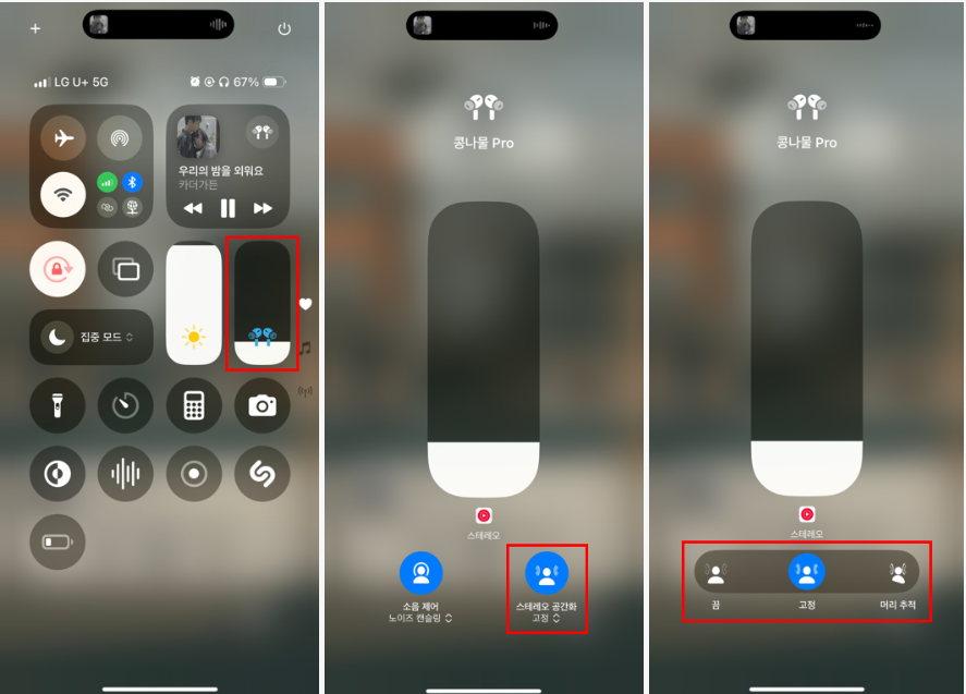 ‘고정’은 소리의 방향이 정중앙에 고정된 형태, ‘머리 추적’은 머리를 돌리면 소리 위치가 변합니다.