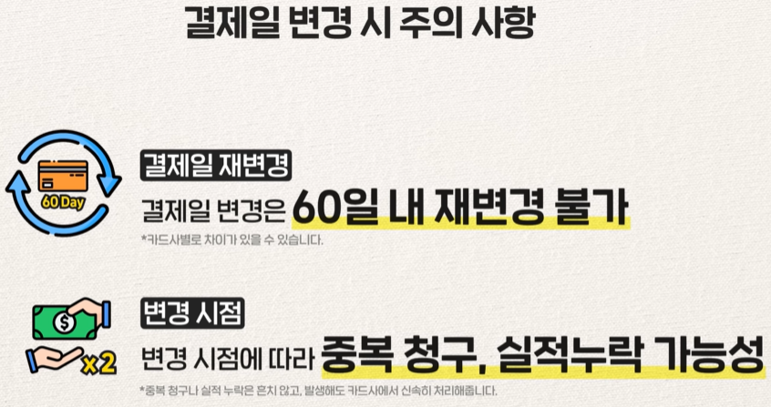 다만, 결제일을 변경할 때는 두 가지 주의해야 할 점이 있습니다.