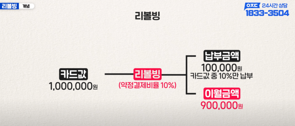 리볼빙은 결제금액의 일부만 내고, 나머지를 다음 달로 이월하는 방식이에요.