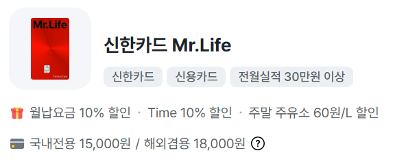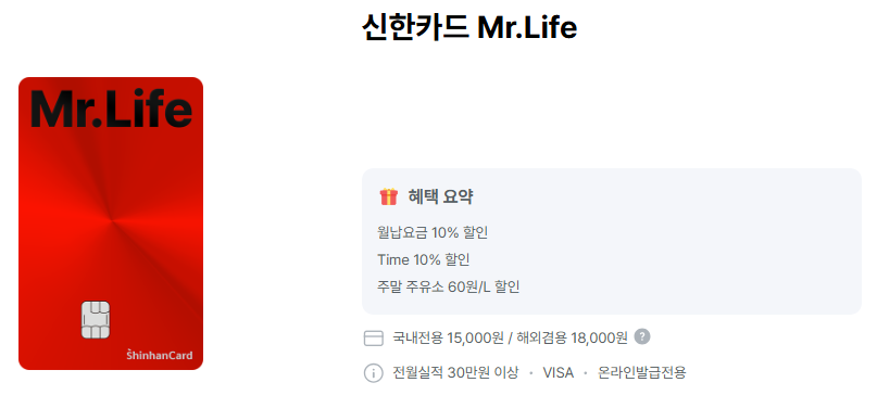 신한카드 Mr.Life는 관리비, 통신요금, 교통, 쇼핑 등 생활 곳곳에서 할인 혜택을 제공합니다.