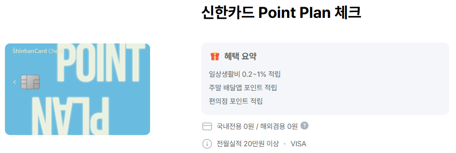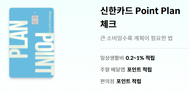 일상 결제에서 꾸준히 포인트를 적립해주는 신한 point plan 체크카드입니다.