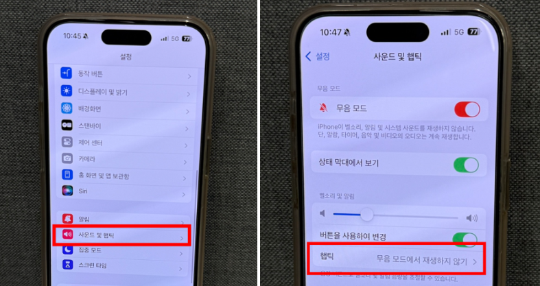 사운드 및 햅틱 → 무음 모드에서 재생하지 않기