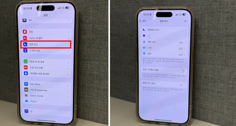 - 방해금지 / 수면 / 개인 / 업무 모드 확인
