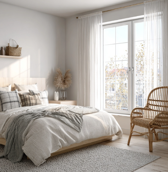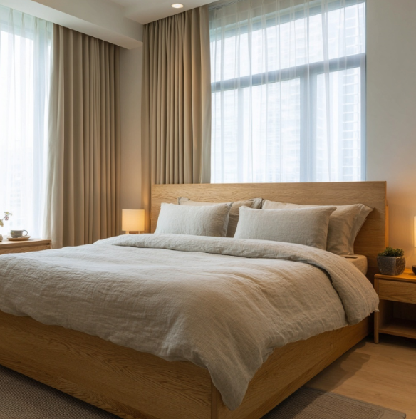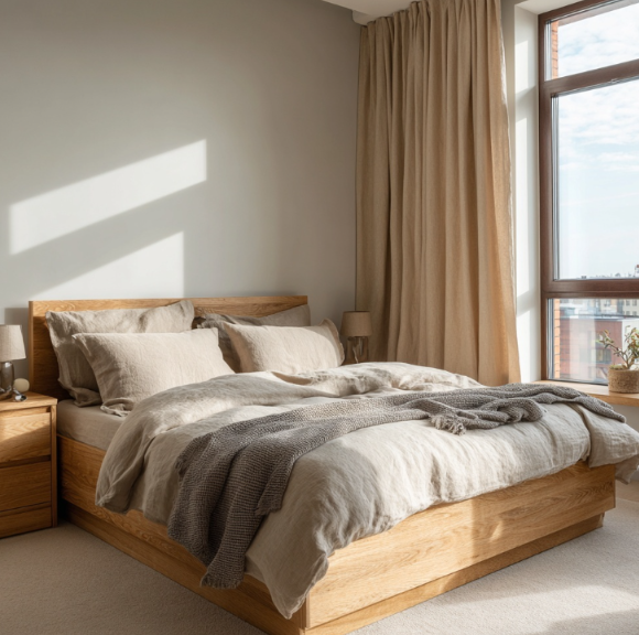 창문 중심형 | 창문 옆 또는 아래 | 침대 + 콘솔형 수납장 | 햇살 각도 고려, 숙면 유도 |