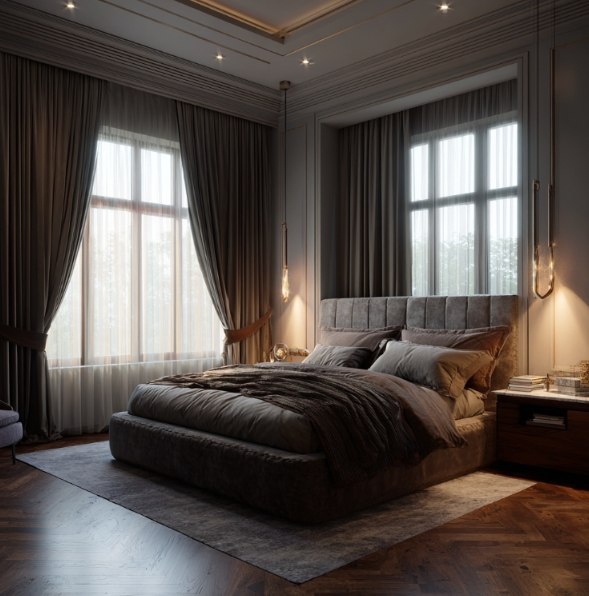 가구 높이 | 침대·협탁·화장대 높이 균형 | 통일감 + 조명 분산 효과 |