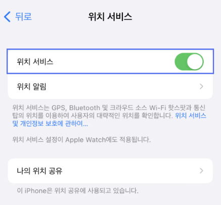 - 설정 → 개인정보 보호 → 위치 서비스 켜기