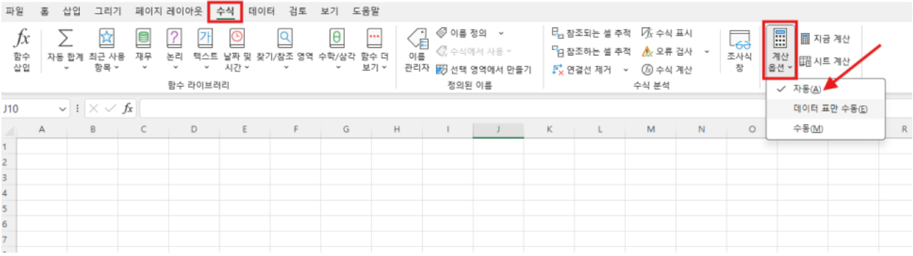 : 상단 메뉴 → [수식] → [계산 옵션] → “자동”