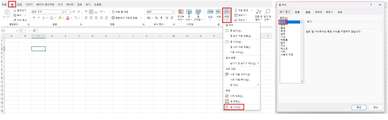 - 셀 선택 → 상단 메뉴 “홈 → 셀 서식 → 일반”으로 변경