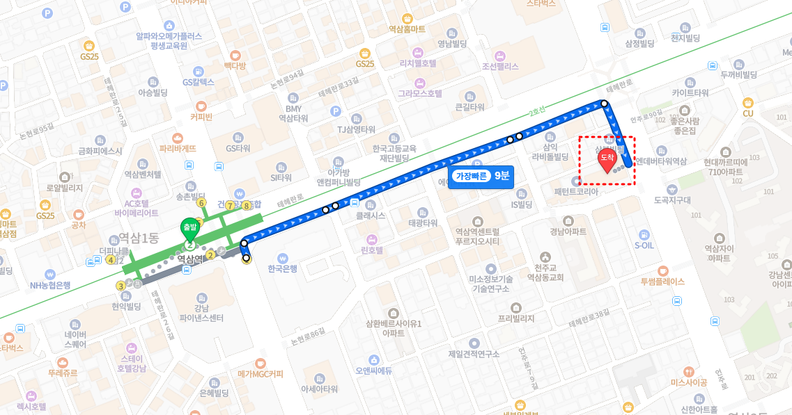 역삼역 2호선까지 도보 9분 걸리며,