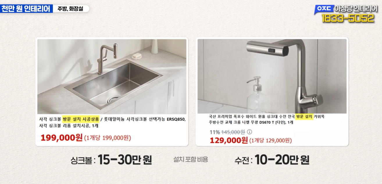 주방 | 싱크볼 및 수전 교체 (시공비 포함) | 약 50~60만 원 |