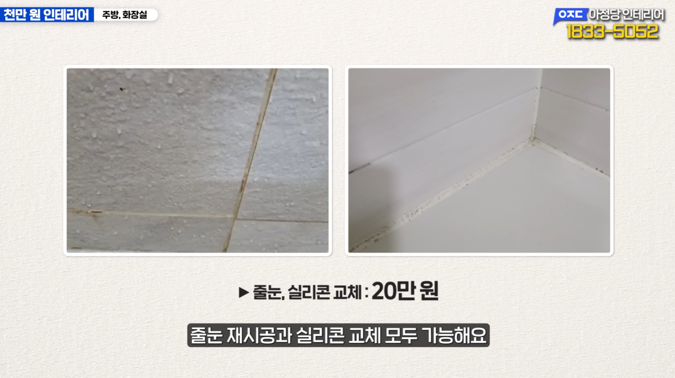 욕실 | 줄눈 재시공 및 실리콘 교체 | 약 20만 원 |