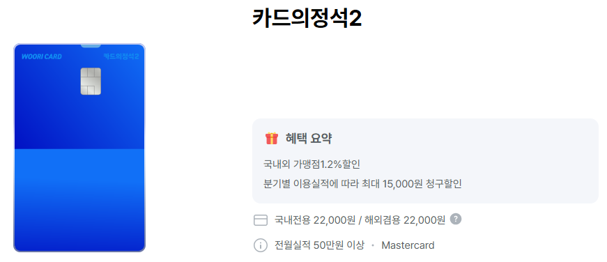 우리카드 카드의정석2는 전월 이용 실적 50만원 이상 시, 국내외 가맹점에서 1.2% 청구할인 혜택을 제공합니다.