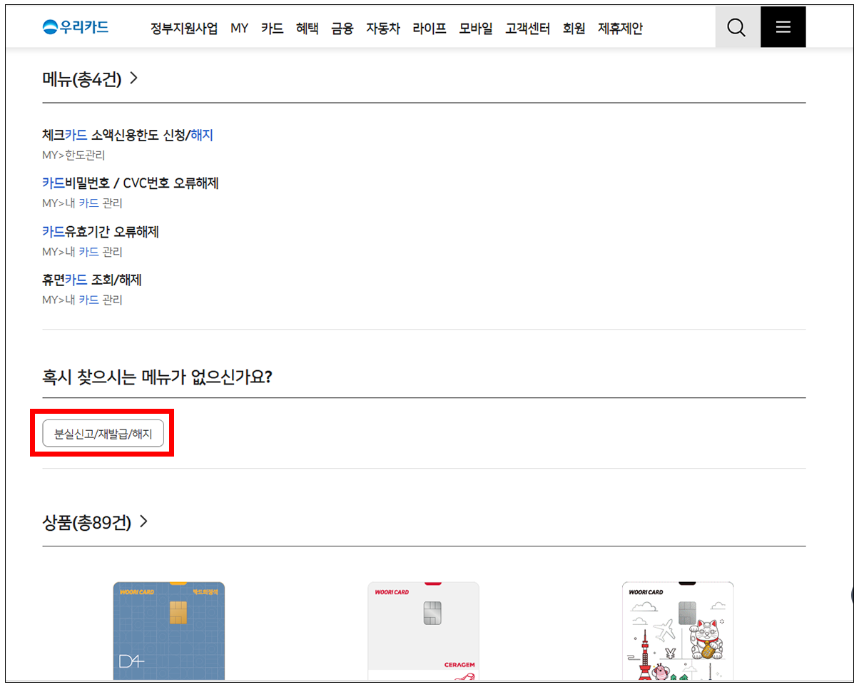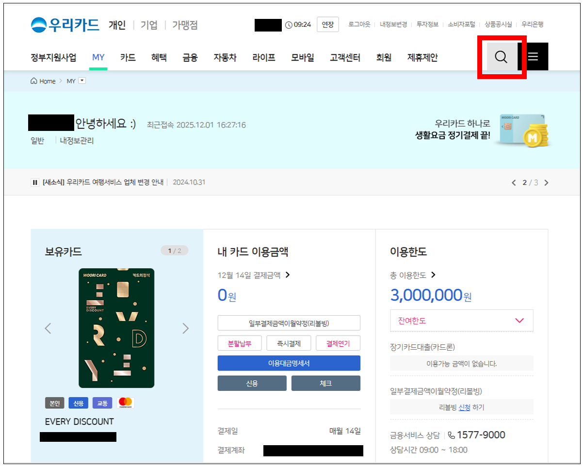 우리카드 공식 웹사이트에 접속해 로그인한 후 검색탭을 눌러줍니다.