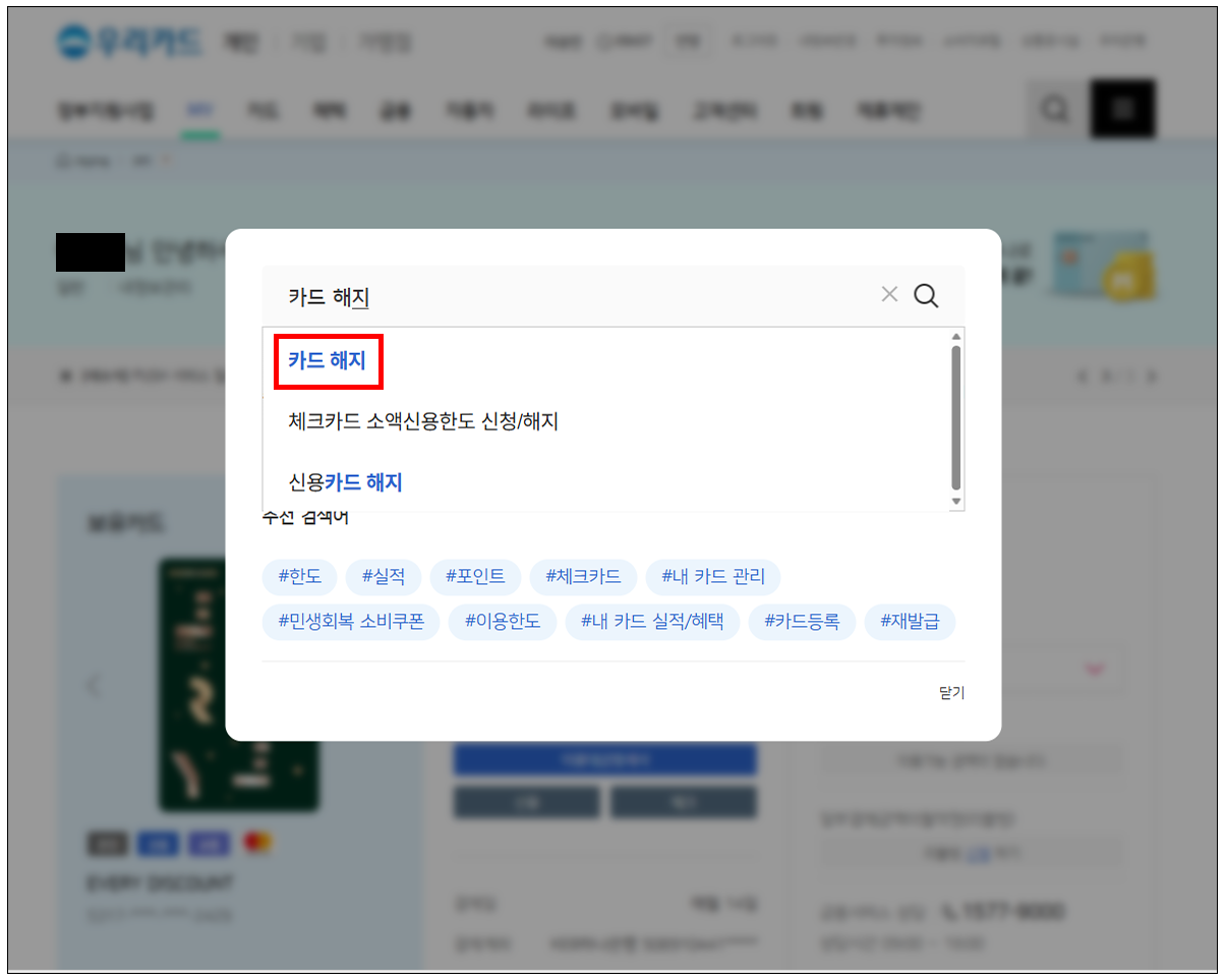 검색 탭에서 ‘카드 해지’ 검색 후 밑에 뜨는 카드 해지를 선택합니다.