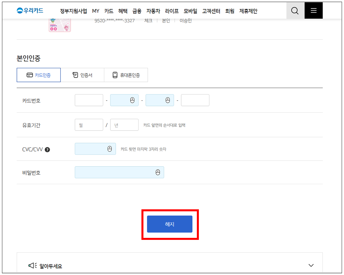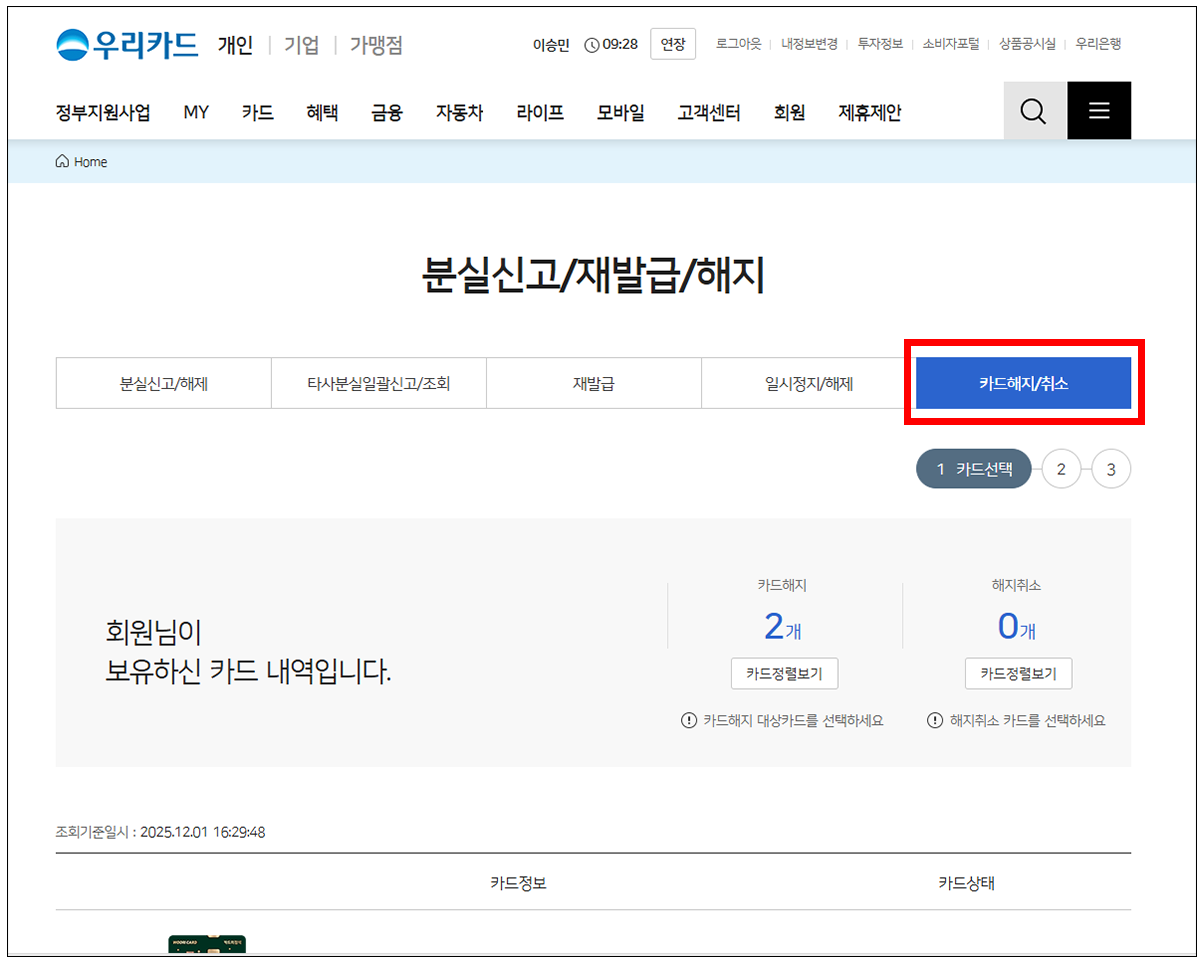 상단 탭에서 맨 왼쪽의 카드해지/취소를 선택합니다.