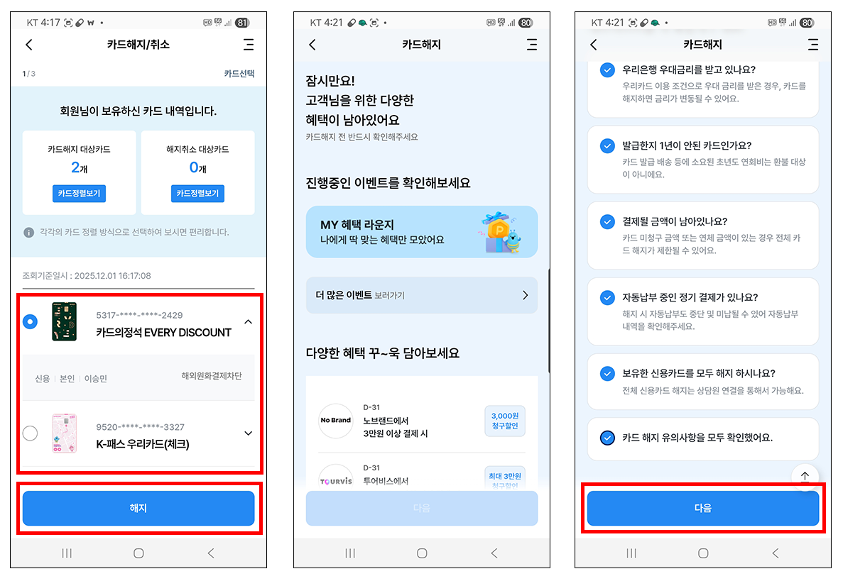 원하는 카드를 먼저 선택한 후 ‘카드 인증’, ‘인증서’, ‘휴대폰 인증’ 중 한가지를 선택해 해지를 진행합니다.