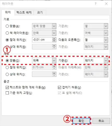 세로의 맞춤을 위쪽으로 선택한 다음 확인을 눌러줍니다.