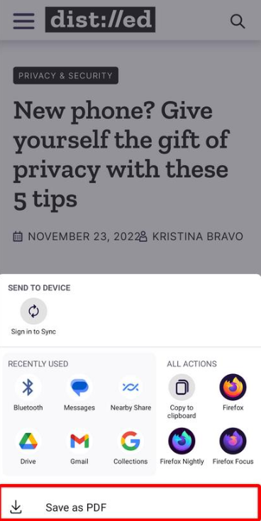 안드로이드 파이어폭스 | 메뉴 → PDF로 저장 | Android Downloads 폴더 저장 |