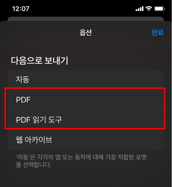 공유 → 옵션 → PDF 선택
