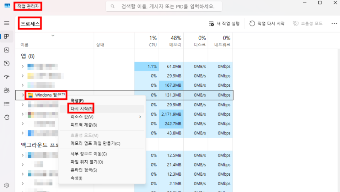 → 'Windows 탐색기' 다시 시작을 통해 복구할 수 있습니다.