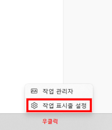 1) 작업표시줄 빈 공간을 우클릭하고