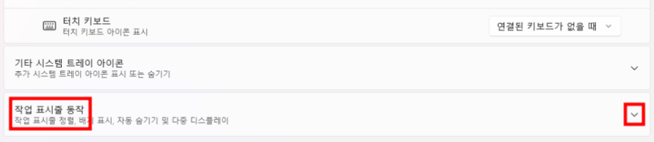 2) 설정 화면에서 '작업표시줄 동작' 메뉴로 이동합니다.