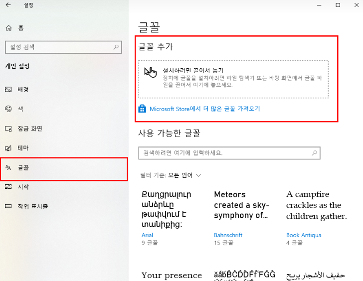 ③ 설정창 드래그 | 설정 > 개인 설정 > 글꼴 | 파일을 끌어다 |
