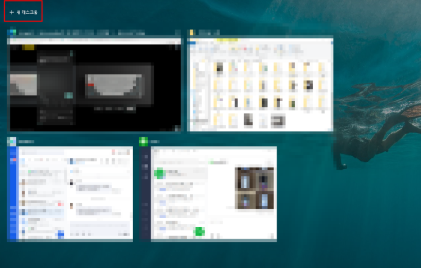 - Windows + Tab → 화면 아래 ‘새 데스크톱 추가’를 클릭