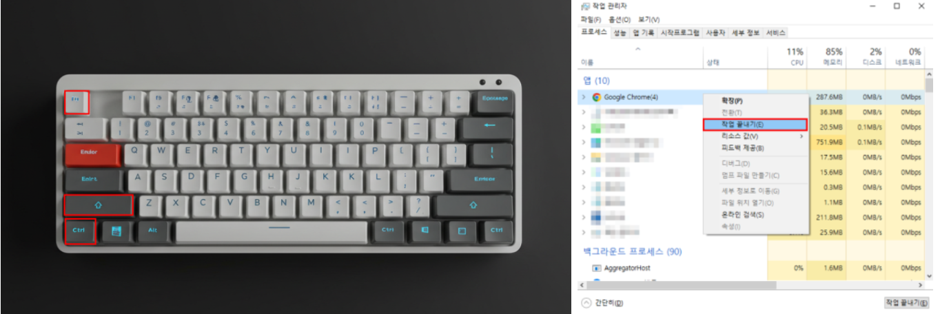 단축키로 해결되지 않을 땐 작업 관리자를 이용해 보세요.