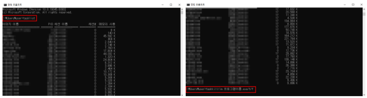 - taskkill /im 프로그램이름.exe /t /f 입력 → 해당 작업을 종료합니다
