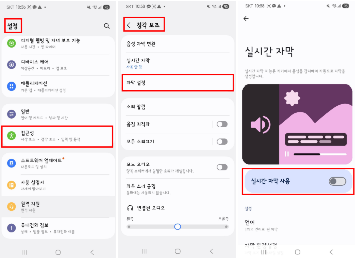 1. 설정 → 접근성 → 청각보조 → 실시간 자막 끄기