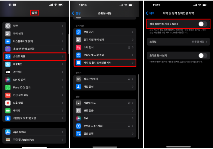 - 아이폰 설정 앱 → 손쉬운 사용 → 자막 및 청각 장애인용 자막