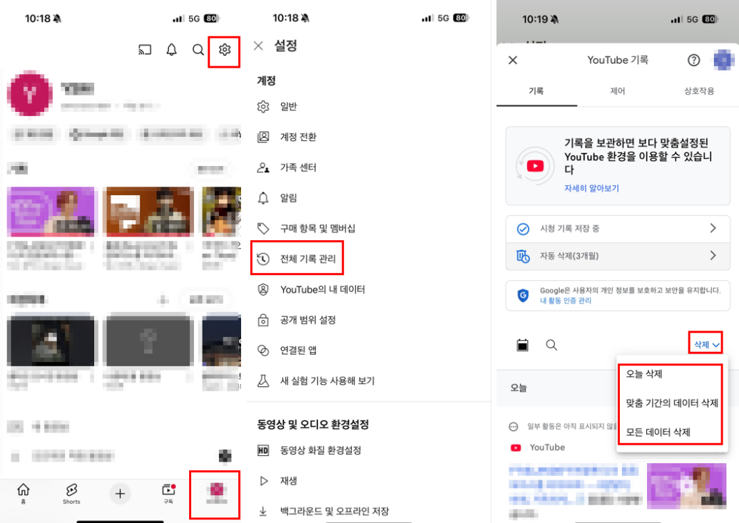 유튜브 앱에서 [설정] - [전체 기록 관리]에 들어간 후