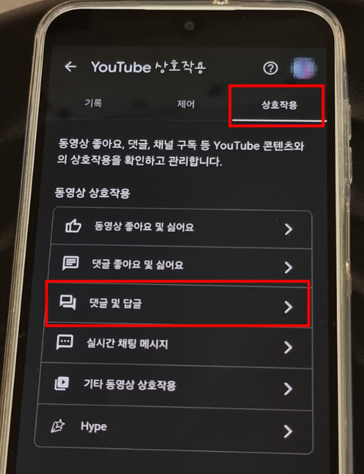③ 상호작용 선택 → 댓글 및 답글