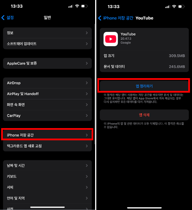 - 모바일 → 유튜브 앱 캐시 삭제 후 재실행