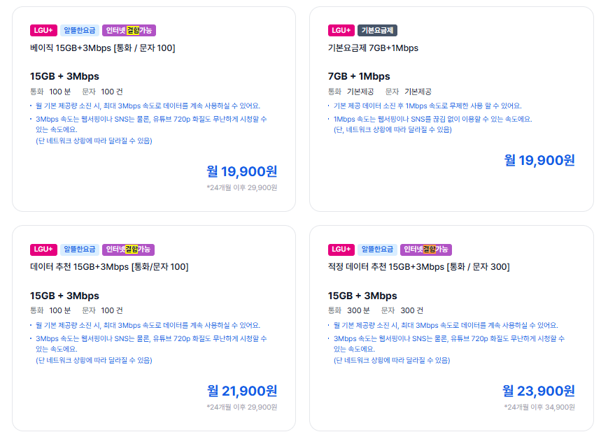 베이직 15GB + 3Mbps | 15GB 이후 3Mbps 무제한 | 통화 100분, 문자 100건 | 19,900 24개월 이후 29,900원 |