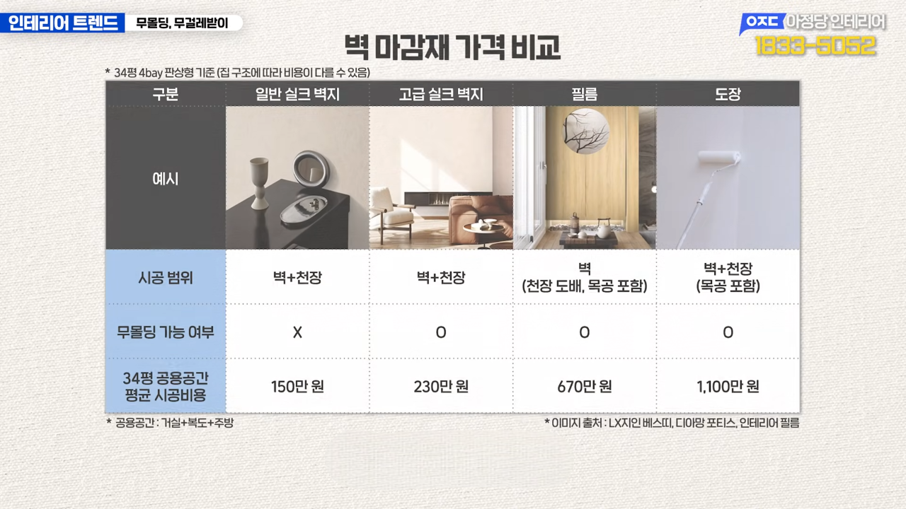 조건이 같아도 인테리어 비용 및 실력 차이는 천차만별