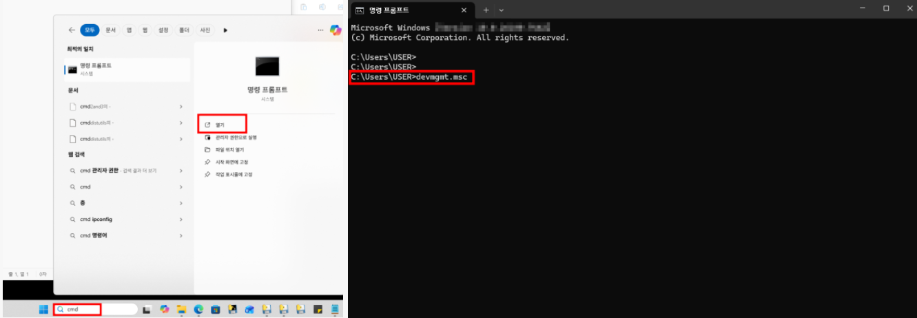 - 시작 메뉴 또는 검색창에서 CMD 입력
