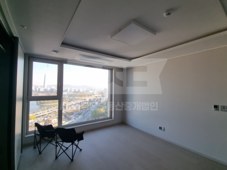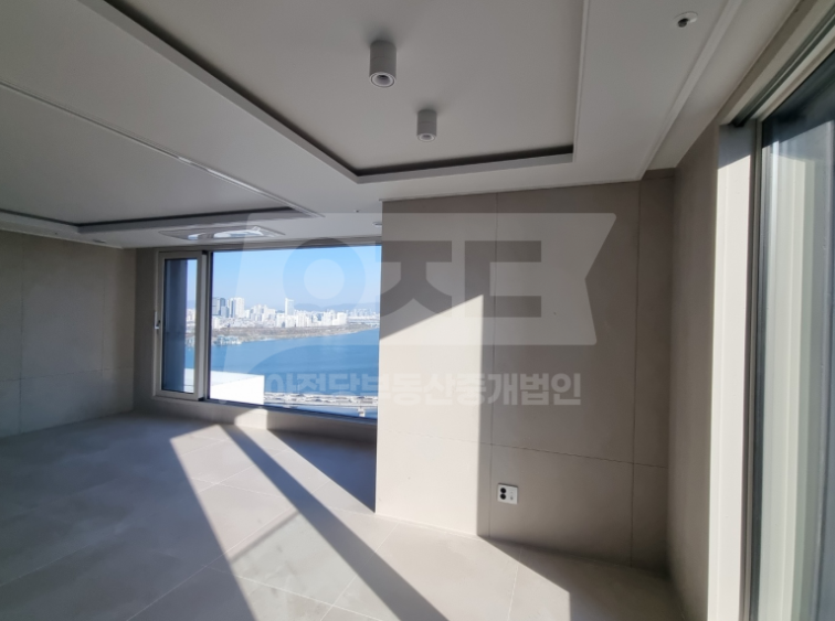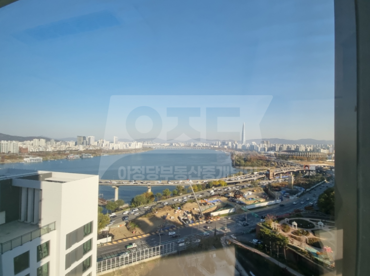 탁 트인 창 너머로 한강과 청담대교가 보이며,