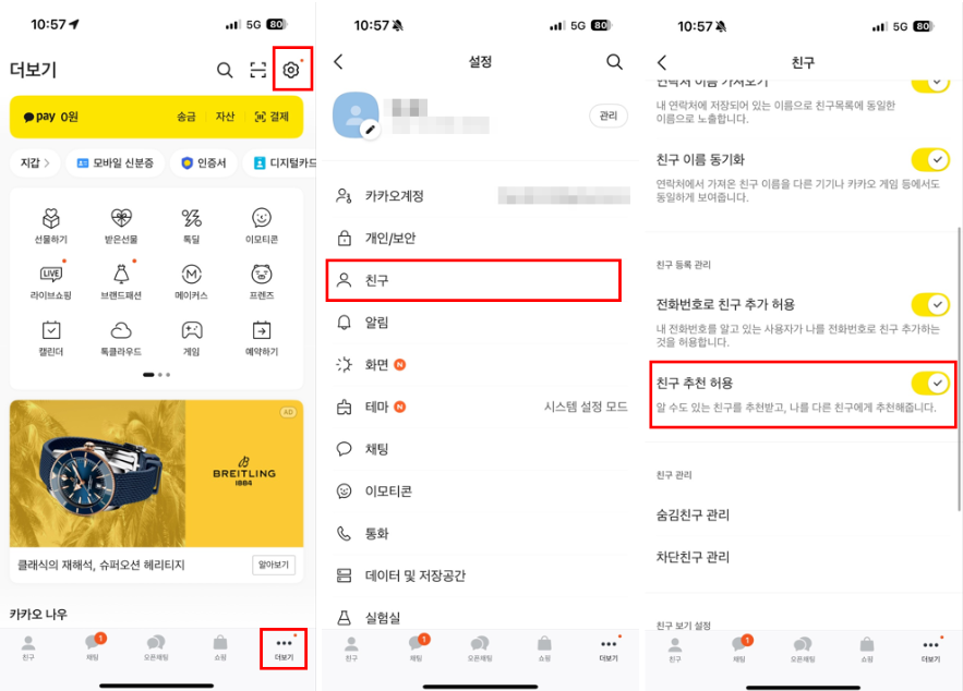 4. ‘친구 추천 허용’ 스위치 ON/OFF 선택
