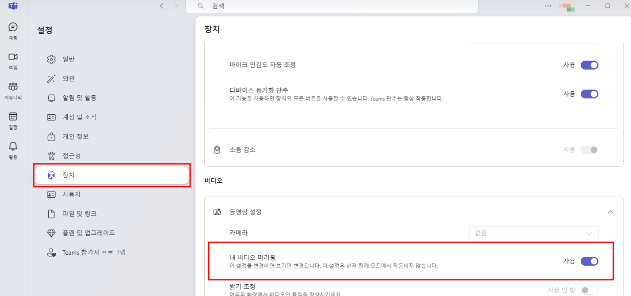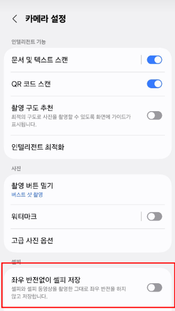 전면 카메라 좌우 반전 켜기를 선택해주세요!