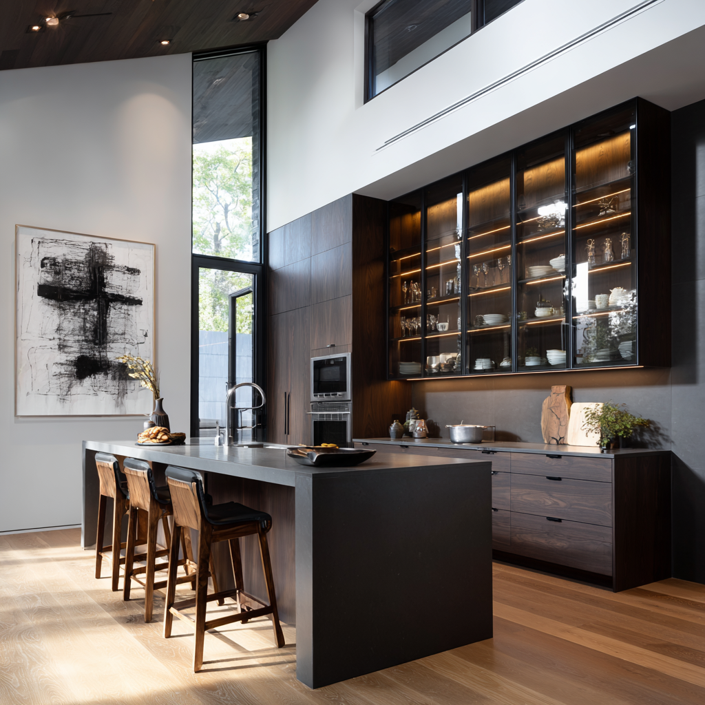 블랙·다크우드 + 2700~3000K 조명 조합 선호바 중심 구조