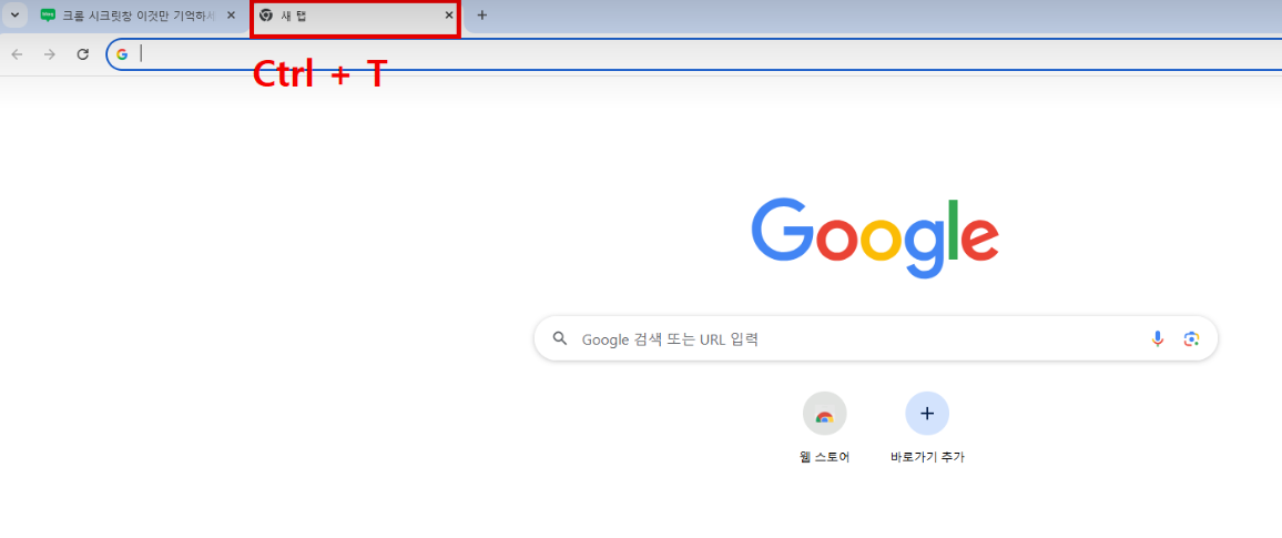 새 탭 열기 : Ctrl + T -> 한 번에 새로운 탭을 열 수 있는 기능