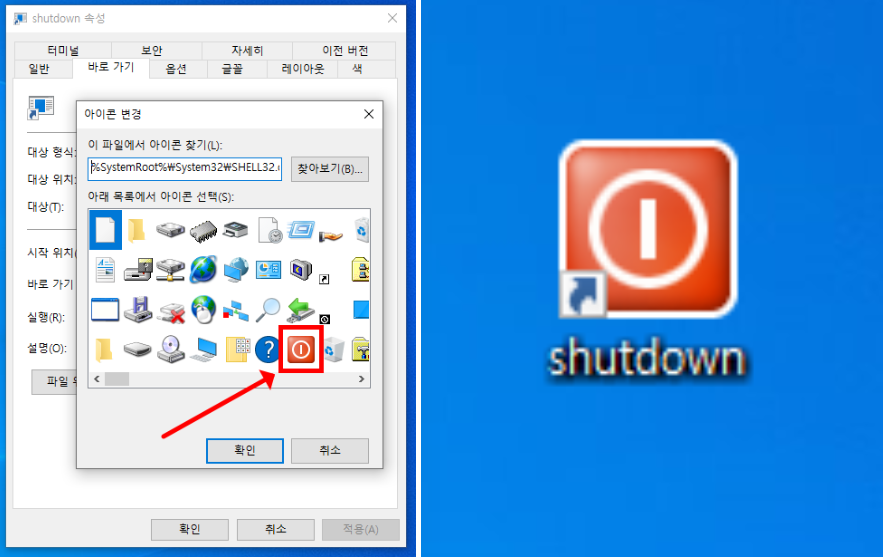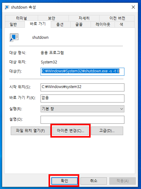 아이콘 변경을 누르고 하단에 있는 확인 버튼을 클릭합니다.