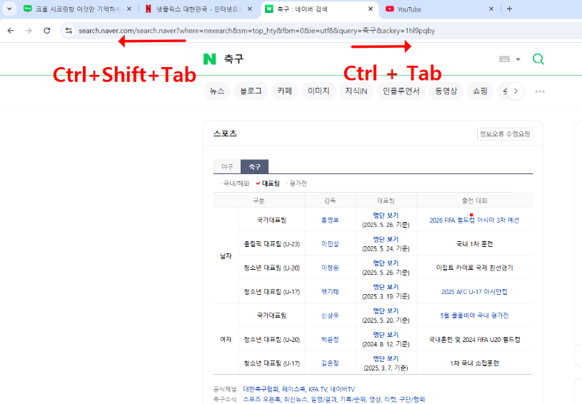 다음 탭 전환 : Ctrl + Tab -> 오른쪽으로 탭을 이동하며 순서대로 화면을 넘기기 가능