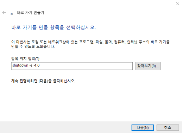 바로 가기를 만들 항목에 shutdown -s -t 0 을 입력해주시면 되는데요.