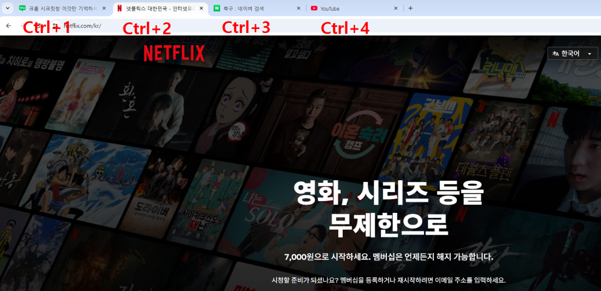 특정 탭 이동 : Ctrl + 숫자 -> 열려 있는 탭 중 특정 탭으로 바로 이동하고 싶을 때