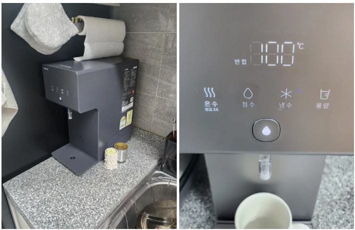 디자인이 이쁘고 크기가 작아서 좋아요 물맛이 깔끔해서 좋아요 직관적이고 반응속도가 빨라요 | 물이 옆으로 튀어요 온수는 바로 받을 수 없고, 시간이 걸려요 |